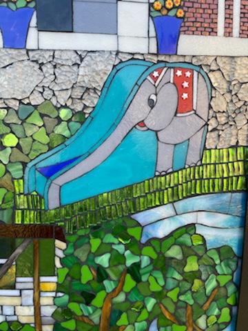 To our surprise, one of my grandkids spotted a memorial to the beloved elephant slide yesterday as we admired the new mosaic murals in our downtown area. There he was all shiny and bright!